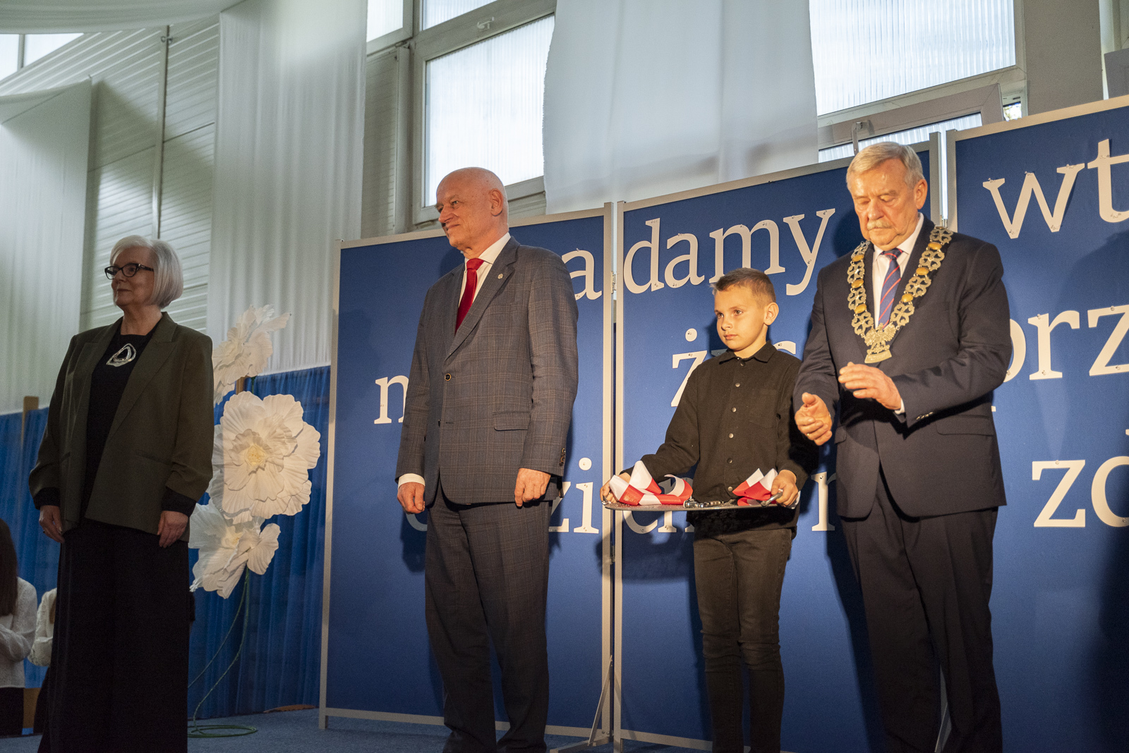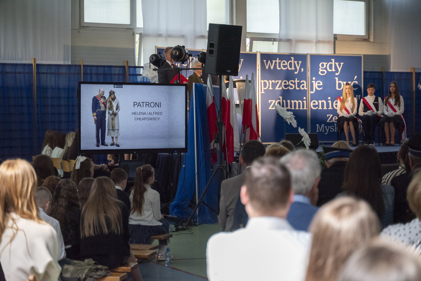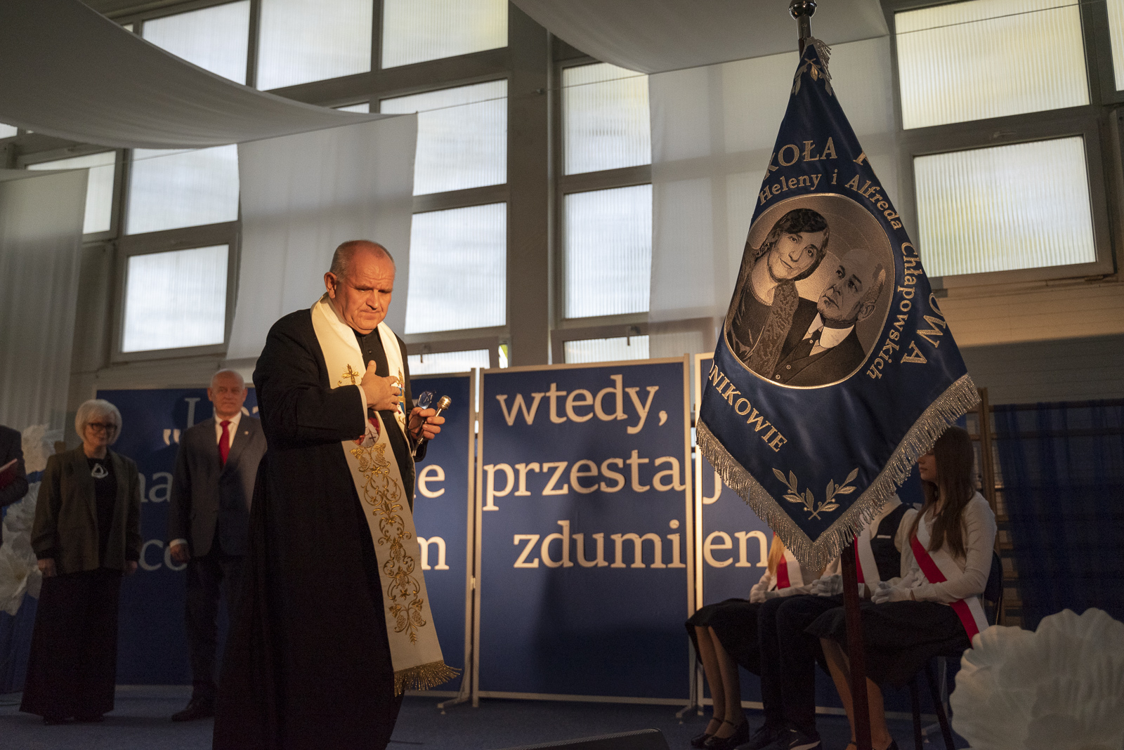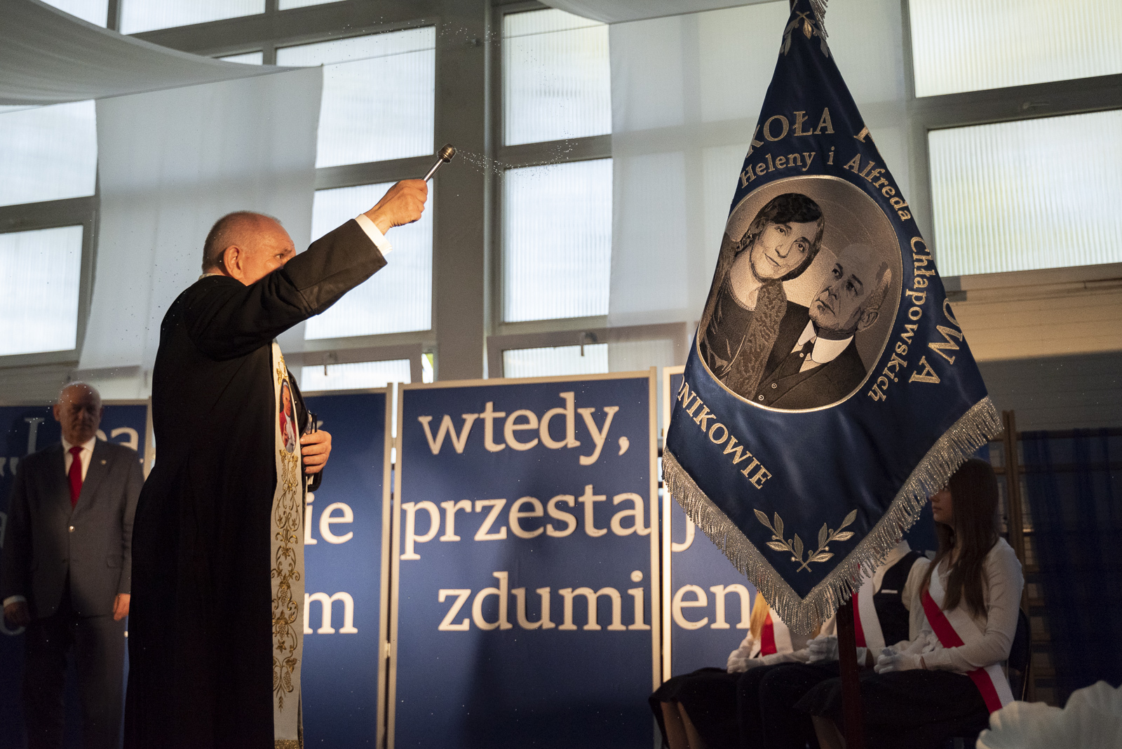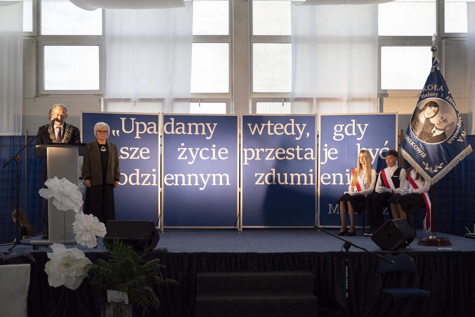 Po przemówieniach Jan Szczepaniak odczytał uchwałę o nadaniu szkole imienia Heleny i Alfreda Chłapowskich. Następnie ks. Krzysztof Lewandowski poświęcił nowy sztandar, który stał się jednym z najważniejszych symboli tego dnia. Doniosłym momentem było symboliczne wbicie gwoździ przez fundatorów, po czym sztandar został przekazany przez wójta Andrzeja Przybyłę na ręce dyrektor szkoły, a następnie pocztowi sztandarowemu. Jeden z uczniów dokonał jego uroczystej prezentacji, po czym przedstawiciele społeczności uczniowskiej złożyli ślubowanie godnego reprezentowania sztandaru oraz imienia szkoły. Ten fragment ceremonii szczególnie mocno akcentował wagę tradycji, odpowiedzialności i ciągłości szkolnej wspólnoty.